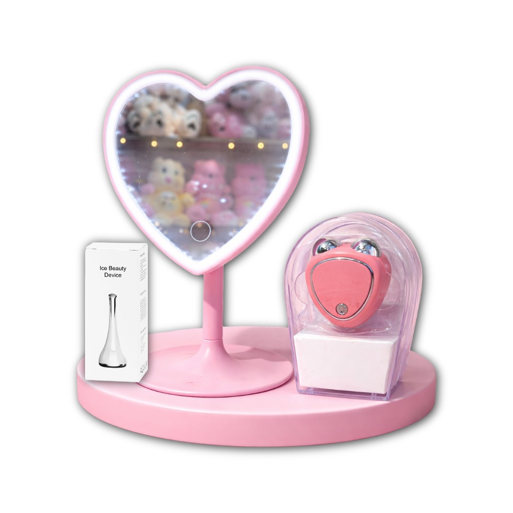 Kit beauty facial que combina estética y funcionalidad en un solo producto. Incluye un espejo LED con diseño en forma de corazón y dos masajeadores faciales, ideal para una rutina de cuidado de la piel completa desde casa.